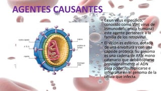 El VIH es un retrovirus esférico que infecta células del sistema inmunológico. Se transmite a través del sexo sin protección, el compartir agujas contaminadas o de madre a hijo. Los síntomas pueden incluir hinchazón de ganglios, diarrea y pérdida de peso. El diagnóstico se realiza mediante una prueba de sangre. El tratamiento incluye medicamentos antirretrovirales y para enfermedades oportunistas.