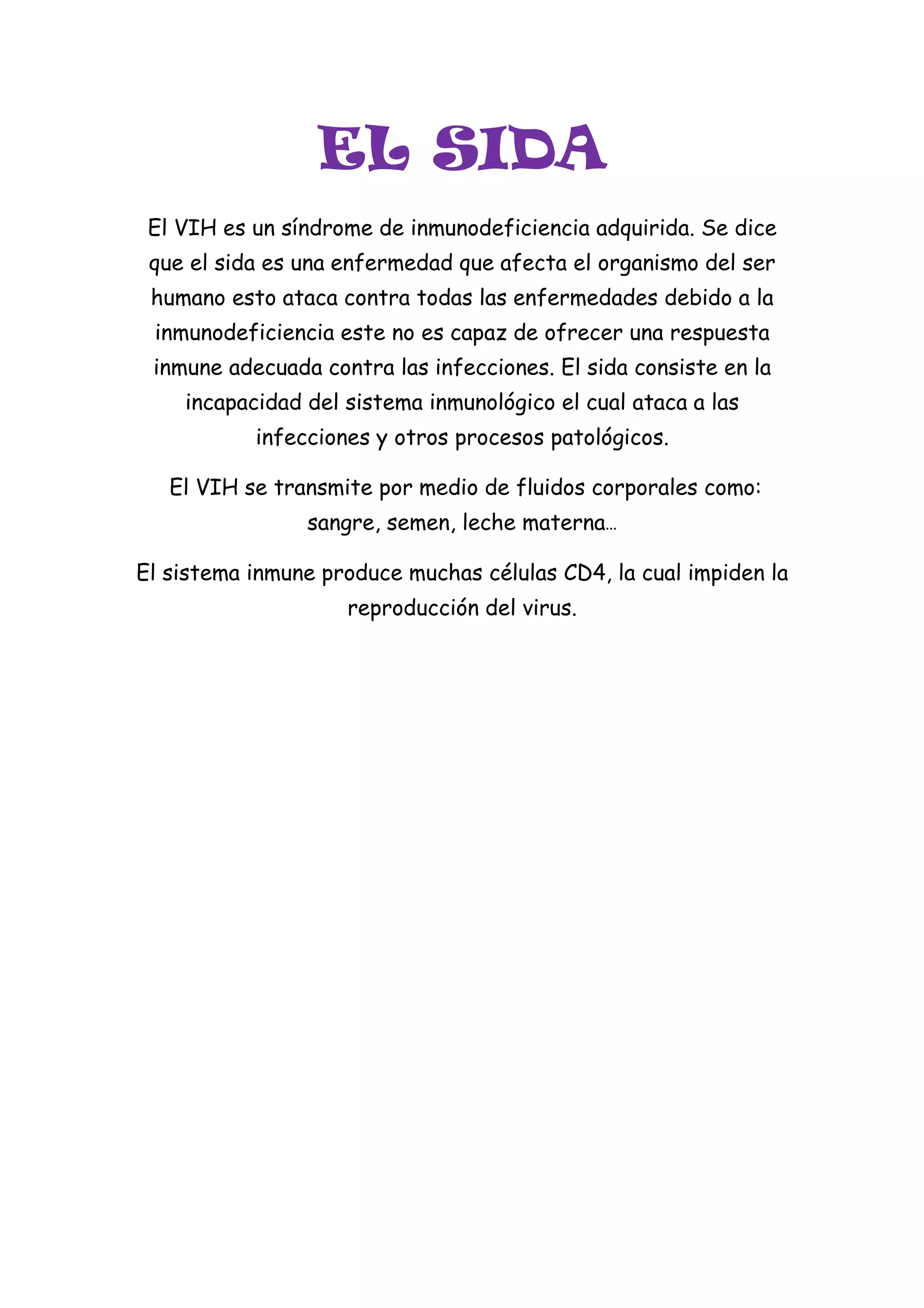 El VIH es un virus que causa el SIDA al debilitar el sistema inmune al reducir las células CD4, lo que impide combatir infecciones. El SIDA se transmite a través de fluidos corporales como la sangre, el semen y la leche materna y consiste en la incapacidad del sistema inmune para defender al cuerpo de infecciones y enfermedades.