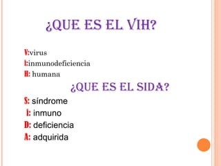 El documento explica brevemente qué es el VIH y el sida. El VIH es el virus de la inmunodeficiencia humana y el sida es la etapa avanzada de la infección por el VIH. El virus debilita las defensas del cuerpo de forma progresiva. Se transmite principalmente a través de relaciones sexuales sin protección, compartir agujas contaminadas o de madre a hijo. Los preservativos son efectivos para prevenir la transmisión. La única forma de detectar el virus es mediante una prueba de sangre. Los tratamientos