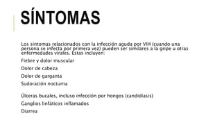 El documento describe los síntomas y causas del VIH/SIDA. Los síntomas de la infección aguda por VIH son similares a los de la gripe e incluyen fiebre, dolores musculares y de cabeza, así como úlceras bucales y ganglios linfáticos inflamados. El virus se transmite principalmente a través del contacto sexual sin protección, la sangre y de madre a hijo durante el embarazo o la lactancia, pero no por contacto casual, mosquitos, deportes o tocar objetos compartidos.