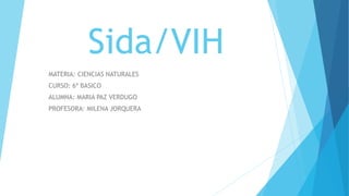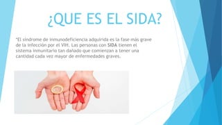 El documento resume el VIH y el SIDA, explicando que el VIH ataca el sistema inmunitario y puede causar SIDA si no se trata. No tiene cura actualmente. El tratamiento implica medicamentos antirretrovirales que reducen la cantidad de virus. Se transmite principalmente a través de relaciones sexuales sin protección o contacto con sangre infectada. La prevención incluye el uso correcto de preservativos y mantener una relación monógama con parejas no infectadas.