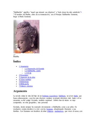 La novela Siddhartha relata la búsqueda espiritual de un hombre hindú llamado Siddhartha para alcanzar la sabiduría suprema. Abandona su hogar para unirse a los samana, luego conoce a Buda pero decide su propio camino. Vive una vida placentera con su amante Kamala y luego el hastío lo lleva a la desesperación hasta reencontrarse con un barquero llamado Vasudeva de quien aprende. Al final, tras varias experiencias, Siddhartha alcanza la ilumin
