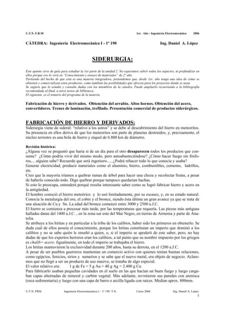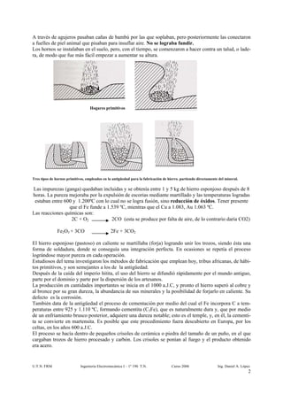 El documento presenta una breve revisión histórica de la fabricación del hierro y el acero desde la antigüedad hasta la revolución industrial, describiendo los procesos primitivos utilizados por los hititas y cómo se difundió su uso. También resume los principales tipos de productos siderúrgicos, minerales de hierro y sus propiedades, así como los procesos básicos de fabricación de hierro y acero en altos hornos y convertidores.