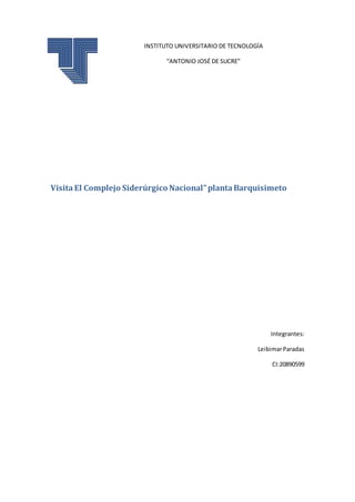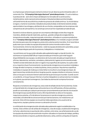 Este documento resume la visita a la planta Sidetur en Barquisimeto. Se observó que la planta produce acero de alta calidad para la construcción y la industria, y que cuenta con sistemas de protección contra incendios como detectores de humo, alarmas y extintores. Sin embargo, algunos equipos de detección automática no funcionaban correctamente. También se señaló que los hornos industriales representan un alto riesgo de incendios o explosiones si entra agua en contacto con los metales fundidos, por lo que se recomienda real