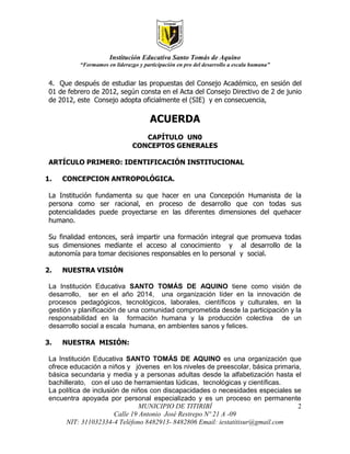 Este documento presenta el Sistema Institucional de Evaluación (SIE) de la Institución Educativa Santo Tomás de Aquino. El SIE fue desarrollado por mesas de trabajo y aprobado por el Consejo Directivo. El SIE contiene criterios y orientaciones para la aplicación del Decreto 1290 de 2009 sobre evaluación y promoción de estudiantes. El documento también presenta la visión, misión y dimensiones de aprendizaje de la institución.