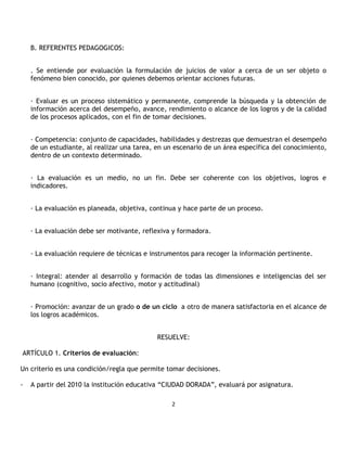 Este documento establece los criterios de evaluación y promoción escolar para los estudiantes de la institución educativa "Ciudad Dorada" a partir del año 2010. Define una escala de valoración de 1 a 5 y los criterios para la promoción, incluyendo un desempeño básico en todas las asignaturas, una asistencia mínima, y pruebas de recuperación para los estudiantes con desempeño bajo. También describe las estrategias de evaluación integral como autocontrol de logros, observación continua, y planes de mejoramiento.