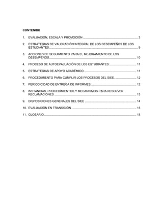Este documento presenta el Sistema de Evaluación y Promoción Escolar (SIEE) de la Institución Educativa Eustaquio Palacios. Describe los criterios de evaluación, escala de valoración, proceso de promoción y estrategias de apoyo académico. Establece que la evaluación es un proceso formativo, continuo e integral que cuenta con la participación de la comunidad educativa. Además, define desempeños bajo, básico, alto y superior para valorar el aprendizaje de los estudiantes.