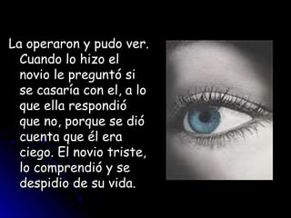 Este documento presenta una historia corta sobre una joven ciega que recibe un trasplante de ojos y puede ver por primera vez. Cuando su novio le propone matrimonio, ella lo rechaza al darse cuenta de que él es ciego. El novio acepta su decisión y le pide que cuide bien de sus nuevos ojos. El documento también incluye algunos consejos y reflexiones sobre la vida.