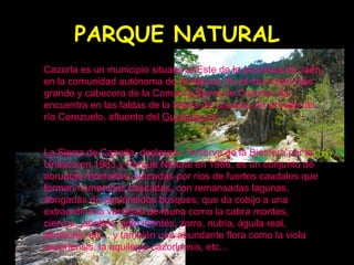 El documento describe la Sierra de Cazorla y las actividades de aventura que se pueden realizar en la zona, como descenso de cañones, circuitos multiaventura con senderismo, rapel, tirolina y escalada, piragüismo en kayak, tiro con arco, paintball, paseos a caballo, y juegos como gymkanas y pistas de rastreo.