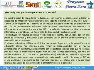 El documento describe las razones para introducir y generalizar el uso de las TIC en las aulas escolares. Explica que las computadoras pueden usarse de dos formas: como una herramienta complementaria o integrando más profundamente sus capacidades interactivas y de comunicación. También describe los antecedentes y justificación de un proyecto educativo en una escuela primaria vespertina en Huauchinango, Puebla, México, cuyo objetivo es mejorar los resultados académicos e integrar a la comunidad a través del uso de las TIC.