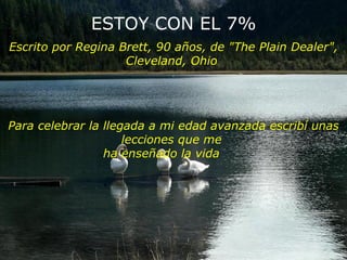 ESTOY CON EL7% Escrito por Regina Brett, 90 años, de "The Plain Dealer", Cleveland, Ohio . Para celebrar la llegada a mi edad avanzada escribí unas lecciones que me ha enseñado la vida