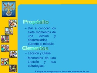 El documento describe los siete momentos de una lección de aprendizaje cooperativo. Estos momentos son: 1) la creación de ambientes favorables para aprender, 2) la orientación de la atención de los alumnos, 3) la recapitulación de lo aprendido, 4) el procesamiento de la información, 5) la evaluación y celebración de lo aprendido, 6) la interdependencia social positiva entre los miembros del grupo, y 7) la reflexión sobre los procesos y resultados del aprendizaje. El documento también proporciona ejemplos de