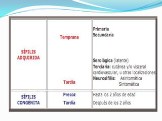 Este documento describe la sífilis, incluyendo su agente causal, patogénesis, clasificación, manifestaciones clínicas y tratamiento. La sífilis es causada por la bacteria Treponema pallidum y puede manifestarse como sífilis primaria, secundaria, latente o terciaria si no es tratada. La sífilis congénita puede ocurrir cuando una madre infectada transmite la infección a su feto y puede causar abortos, prematurez o muerte neonatal. El tratamiento adecuado incluye antibióticos como la penicilina.