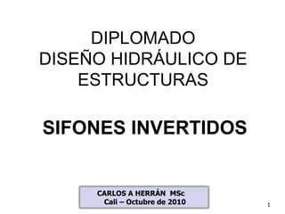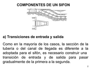 Este documento describe los componentes principales de un sifón invertido y el procedimiento para su diseño hidráulico. Explica que un sifón necesita transiciones de entrada y salida, y puede incluir una rejilla de entrada. También requiere tuberías de presión para transportar el agua. El diseño implica calcular el diámetro, la altura mínima de ahogamiento, y las pérdidas de carga por fricción y accesorios para garantizar que el sifón funcione de manera adecuada.