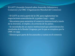 El GATT se creó en 1947 para regular el comercio internacional entre 23 países a través de negociaciones arancelarias. Fue reemplazado por la Organización Mundial del Comercio en 1995 para administrar los resultados de la Ronda Uruguaya y promover el comercio global eliminando aranceles y cuotas. La OMC busca elevar los niveles de vida, lograr el pleno empleo, y generar condiciones para la paz a través de la globalización y la cooperación económica entre países.