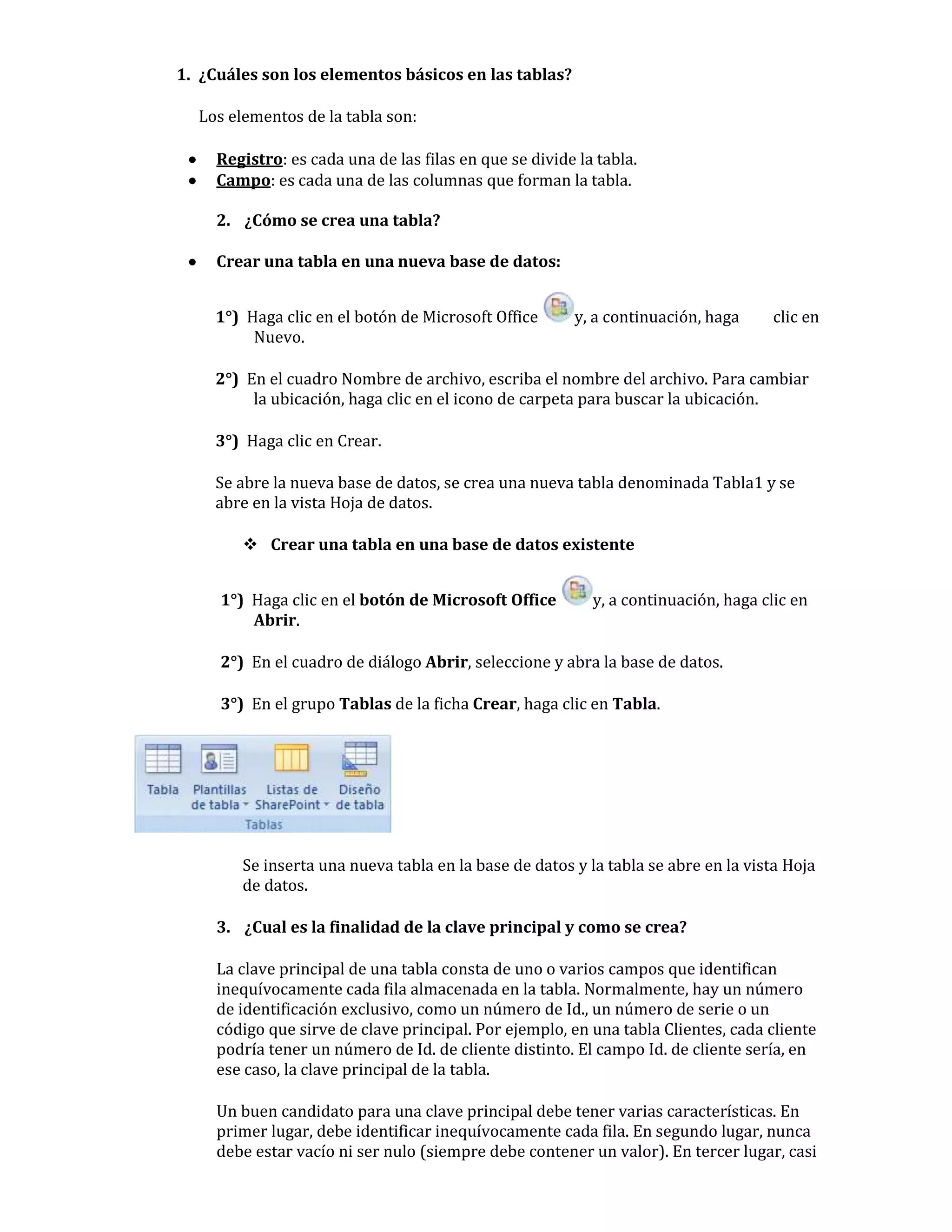 Este documento describe los elementos básicos de las tablas en bases de datos, como registros y campos. Explica cómo crear tablas nuevas y duplicar tablas existentes dentro de una base de datos. También cubre conceptos como claves primarias, propiedades requeridas, máscaras de entrada, reglas y texto de validación, y cómo mover y importar campos entre tablas.