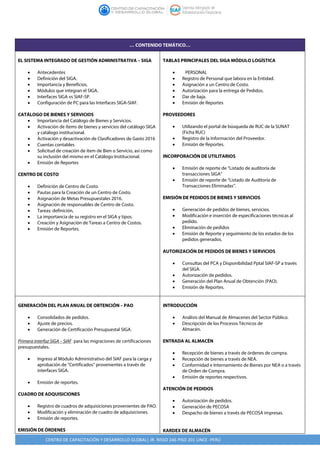 Este documento describe un curso sobre el Sistema Integrado de Gestión Administrativa (SIGA) que se llevará a cabo durante 4 días en octubre. El curso cubrirá módulos como catálogos, centros de costo, personal, proveedores, pedidos, órdenes de compra y almacén. El costo es de S/. 447 para pronto pago o S/. 477 normal, y se aceptan pagos en efectivo, cheque o tarjeta.