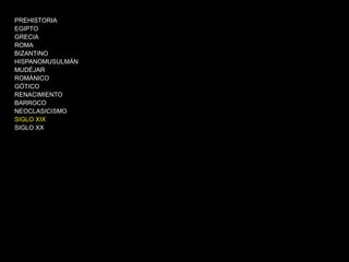 El documento presenta una descripción general de los estilos y movimientos artísticos desde la prehistoria hasta el arte contemporáneo, con un enfoque particular en el siglo XIX y el romanticismo. Se enumeran las principales características de cada período y movimiento artístico, y se proporcionan ejemplos clave de artistas románticos como Géricault, Delacroix y Friedrich.