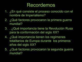El documento presenta una serie de preguntas sobre eventos históricos clave del siglo XX como el imperialismo, las causas de la Primera y Segunda Guerra Mundial, la Revolución Rusa, y los regímenes totalitarios de Europa. También propone una actividad para construir una línea de tiempo con importantes acontecimientos del siglo XX como revoluciones, guerras y procesos políticos.