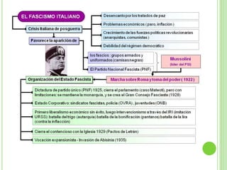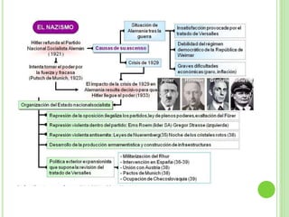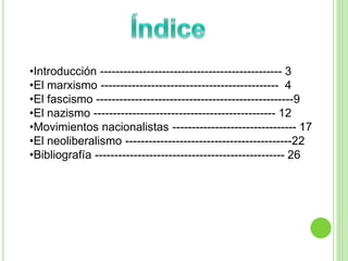 Este documento resume varios movimientos políticos e ideológicos del siglo XX como el marxismo, fascismo, nazismo, movimientos nacionalistas y neoliberalismo. Incluye breves descripciones de sus orígenes, características y líderes principales como Marx, Mussolini y Hitler. También presenta la bibliografía utilizada.