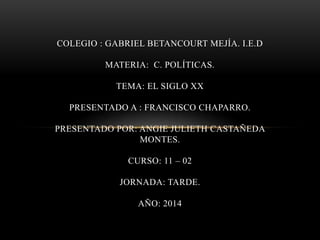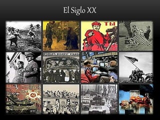 El documento resume los principales eventos e ideologías políticas del siglo XX en Europa, incluyendo el marxismo, fascismo, nazismo, movimientos nacionalistas y neoliberalismo. Explica que el siglo XX estuvo marcado por avances tecnológicos pero también por guerras y genocidios debido al abuso de poder de regímenes totalitarios. Define brevemente cada ideología y sus orígenes.