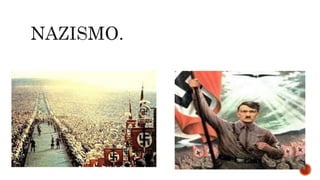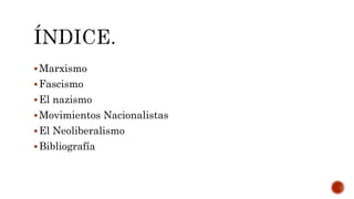El documento presenta información sobre diferentes ideologías y movimientos del siglo XX como el marxismo, fascismo, nazismo, movimientos nacionalistas y neoliberalismo. También describe algunos eventos clave como las guerras mundiales y la exploración espacial. Incluye definiciones, orígenes y características de estas ideologías así como ejemplos históricos.