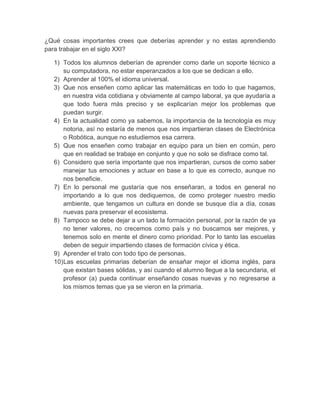 Este documento presenta una lista de 10 cosas importantes que una persona debería aprender para trabajar en el siglo XXI pero que actualmente no se están enseñando de manera adecuada. Entre ellas se incluyen habilidades técnicas como dar soporte a computadoras, aplicar matemáticas a problemas de la vida real, electrónica y robótica. También se mencionan habilidades blandas como el trabajo en equipo, manejo de emociones, protección del medio ambiente, formación cívica y ética, y trato con todo tipo de