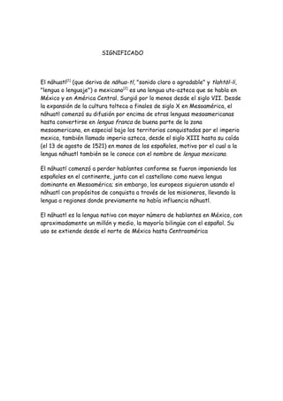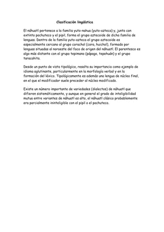 El documento proporciona información sobre el náhuatl, una lengua uto-azteca hablada originalmente en México. Explica que el náhuatl se originó alrededor del siglo VII y se convirtió en la lengua franca del Imperio Azteca, aunque comenzó a declinar con la conquista española. Actualmente, alrededor de un millón y medio de personas hablan náhuatl, principalmente en comunidades rurales de México.