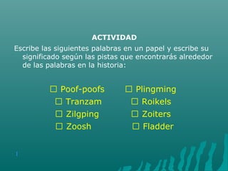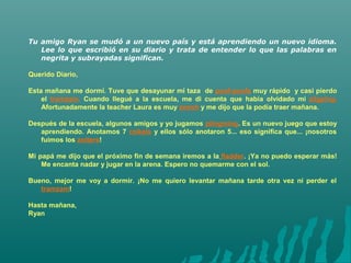 Ryan se mudó a un nuevo país y está aprendiendo el nuevo idioma. En su diario, describe su día y usa palabras en el nuevo idioma, como "poof-poofs" para el desayuno, "tramzam" para el autobús, y "fladder" para la playa. Con pistas del contexto, los estudiantes deben adivinar los significados de estas palabras.
