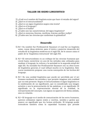 El documento resume los conceptos clave de la teoría del signo lingüístico de Ferdinand de Saussure. Explica que un signo lingüístico está compuesto de un significante (la forma del signo) y un significado (el concepto que representa), y que la relación entre los dos es arbitraria. Define el lenguaje como el medio de comunicación humano y el habla como la realización individual de una lengua. Enumera las características del signo lingüístico y define términos como monema, fonema, morfema y