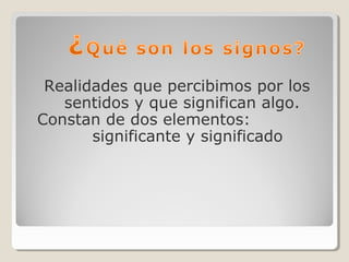 Este documento describe los diferentes tipos de signos, incluyendo signos lingüísticos. Explica que todo signo está compuesto de un significante (la parte material) y un significado (el concepto o idea). Los tipos de signos son síntomas, iconos y símbolos, dependiendo de su relación con el referente. También describe las características de los signos lingüísticos, como ser arbitrarios, lineales, mutables e inmutables, y tener una doble articulación de unidades.