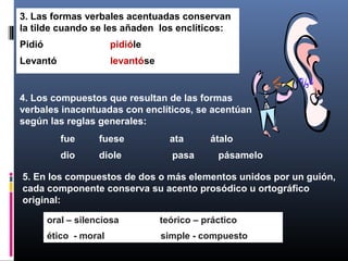 Este documento describe las reglas de acentuación en palabras compuestas en español. Explica que 1) los compuestos formados por varias palabras unidas sin separación siguen las reglas generales de acentuación, 2) los adverbios terminados en -mente mantienen los acentos de sus componentes, y 3) las formas verbales acentuadas conservan la tilde cuando se les añaden enclíticos.