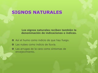 Este documento presenta una discusión sobre diferentes tipos de signos de comunicación. Brevemente describe los signos naturales como humo, nubes y arrugas que indican fuego, lluvia y envejecimiento respectivamente. Luego describe los signos artificiales lingüísticos y no lingüísticos, incluyendo señales, símbolos e iconos. Finalmente, define conceptos clave como código, lenguaje, signo, señal, símbolo e índice.