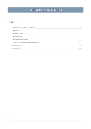 Este documento explica los diferentes signos de puntuación, sus reglas y formas de uso. Describe los signos principales como el punto, coma, punto y coma, dos puntos, puntos suspensivos, signos de interrogación y exclamación. Explica cuándo y cómo usar cada signo correctamente para mejorar la claridad y coherencia del texto. El autor concluye comentando que a pesar de haber leído mucho sobre el tema, sigue encontrando errores comunes en el uso de signos como el punto y coma y el guión.