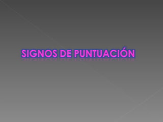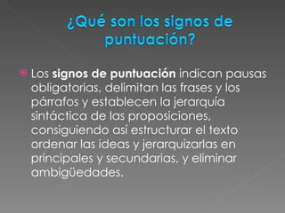 El documento explica el uso de los principales signos de puntuación en español como la coma, el punto y coma, el punto, los puntos suspensivos, los signos de interrogación y exclamación, y las comillas. Describe cómo cada signo indica pausas y jerarquiza las ideas para estructurar el texto y eliminar ambigüedades.
