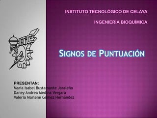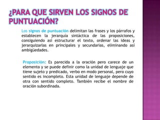 Este documento describe los diferentes signos de puntuación del español, incluyendo la coma, el punto, la raya, las comillas, el paréntesis, los dos puntos, el punto y coma, los puntos suspensivos, los signos de interrogación y admiración, y la diéresis. Explica el uso y propósito de cada signo de puntuación y cómo ayudan a estructurar el texto y ordenar las ideas.