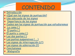 Este documento explica los signos de puntuación más comunes y su uso adecuado. Define la coma, el punto, el punto y coma, los dos puntos, los puntos suspensivos y los signos de interrogación y admiración. Resalta que los signos de puntuación son necesarios para darle sentido y significado adecuado a los escritos y que su mal uso puede cambiar la interpretación de un texto.