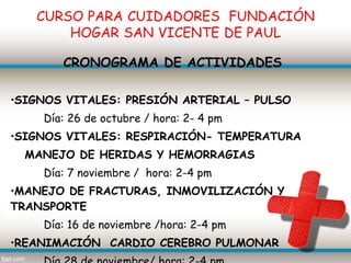 Este documento presenta un cronograma de actividades sobre signos vitales que incluye la presión arterial, el pulso, la respiración y la temperatura. Explica cada uno de los signos vitales, como se miden y sus valores normales. El documento también contiene información sobre cómo tomar el pulso y la presión arterial correctamente.