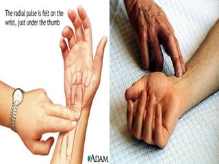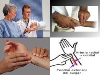 Este documento presenta información sobre los signos vitales. Explica que los cuatro signos vitales son el pulso, la presión arterial, la temperatura y la respiración. Detalla cómo medir cada uno de estos signos vitales, incluyendo sus valores normales. El objetivo es enseñar a los estudiantes de medicina sobre la importancia de monitorear los signos vitales para evaluar la salud de un paciente.