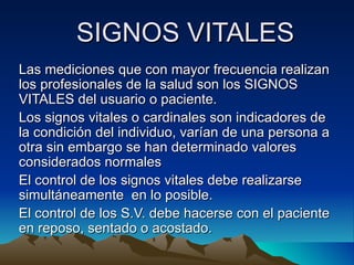Los signos vitales son mediciones esenciales que indican la condición de salud de un paciente, como la temperatura corporal, que se mide normalmente entre 36-37°C. La temperatura se regula a través de mecanismos fisiológicos y de conducta, y puede verse afectada por factores como la edad, el ejercicio, las hormonas y el ambiente. Las alteraciones en la temperatura, como la fiebre o hipotermia, pueden ser señales de enfermedades. La evaluación regular de los signos vitales proporcion