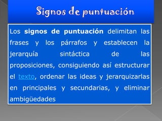 Este documento describe los diferentes signos de puntuación utilizados en español, incluyendo su función y cómo se utilizan correctamente. Explica los puntos (.), la coma (,), los dos puntos (:), el punto y coma (;), las comillas (« », “ ”), los paréntesis (), los signos de interrogación (?), los signos de exclamación (!) y la raya (—). El objetivo es establecer las reglas básicas de puntuación para estructurar el texto y eliminar ambigüedades.