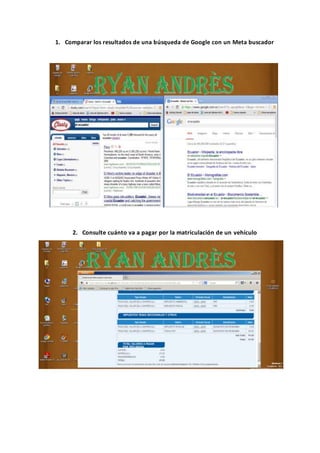 Este documento presenta 29 actividades relacionadas al uso de Internet que un estudiante deberá completar para su asignatura de Informática TIC. Las actividades incluyen realizar búsquedas en Google y meta buscadores, consultar información en sitios web de prensa, radio, y deportes, enviar correos y mensajes, navegar sitios web, calcular tiempos de descarga, y realizar operaciones matemáticas y de conversión de monedas usando Internet.