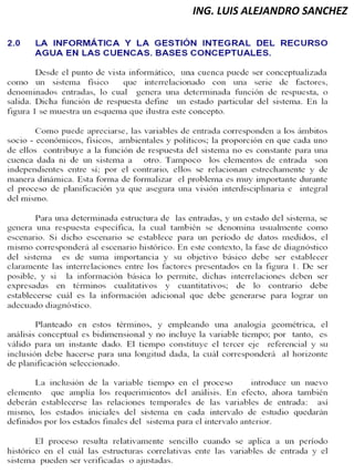 El documento describe un modelo hidrológico mensual para la gestión del recurso agua en cuencas con escasez de registros. Explica los procesos de almacenamiento e infiltración del agua en el suelo y subterráneamente, así como los procesos de transferencia como precipitación, evapotranspiración, escurrimiento e interflujo. El modelo calcula la escorrentía total mensual en una cuenca a partir de estos procesos hidrológicos usando parámetros como la capacidad de almacenamiento del suelo y las a