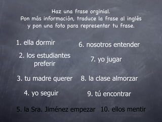 Este documento presenta 10 verbos en español y pide a los estudiantes que hagan oraciones originales con los verbos, las traduzcan al inglés y agreguen una imagen para cada oración. Además, da un ejemplo de oración original en español traducida al inglés con una imagen.