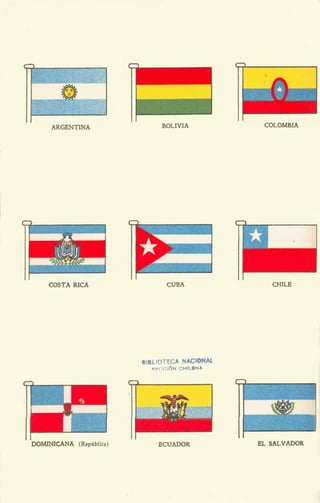 . . / ‘ ,d Los Países Hispanoamericanos México.- Este gran país estál en’América del Norte. En , , MEXICO toda persona que sabe leer y escribir está obli- gada a enseñar a leer a otro mexicano gue no sepa. Cuba.- Este país es una gran isla donde hay,muchas pal- mas, En CUBA hay una planta llamada ‘“caña de azúcar”, que tiene el tallo muy dulce. A los niños les agrada nau- ‘ cho chupar este tallo con gusto a-caramelo. Los cuba-. nos sacan azúcar de esta planta. , ’ -I ’ . RepúbZica Dominicana.- Este pequeño país es ,parte de’.una ., isla. que está al lado de CUBA. Allí se está haciendo una gran cruz en recuerdo de Cristóbal Colón. Esta cniz es- tá tendida en el suelo y tiene más de dos kilómetros ,de , largo. * Akdrico Central- Esta parte de América está formada par , RAGUA, COSTA RICA. Y PANAMA; E- todos estos países ha. ce bastante calor, y se‘producen e1 café, el arroz, la vai- nilla, los plátanos, las piñas y otras frutas muy ricas., En NICARAGUA está el único lago del mundo donde hay tiburones. Y en PANAMA se encuentra el canal más grande que ha, hecho el hombre. Por este canal pasan los bu-’ ques entre las océanos Pacífico y Atlántico. ’ 10s países de,GUATEMALA, HONDURAS, EL SALVADOR, NICA- . - ’ l. Ye,gxue/a.- Este pais es muy rico‘porque tiene mucho pe- tróleo. En Venezuela nació el Gran General y Liberta- dor Simón Bolívar, qtie mur%,hace más de cien años. ‘Todo niño debe pedirle a su maestra qué le cuente “el sueño de Bolívar”. . ’
