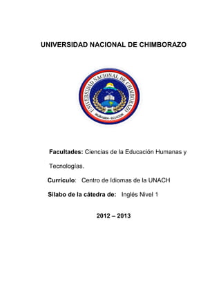 El documento presenta el silabo del curso de Inglés Nivel 1 de la Universidad Nacional de Chimborazo. El curso tiene como objetivo capacitar a los estudiantes en el uso básico del idioma inglés para comunicarse de manera significativa. El curso consta de 5 unidades que cubren temas como presentaciones personales, descripciones de objetos y lugares familiares, rutinas diarias y tiempo libre. Cada unidad incluye objetivos, contenidos gramaticales, vocabulario y actividades para desarrollar las 4 habilidades del idioma de manera