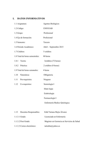 Este documento presenta la información de un curso de Agentes Biológicos para estudiantes de enfermería en la Universidad Regional Autónoma de los Andes. El curso se ofrece en el tercer semestre y cubre temas relacionados a los diferentes agentes biológicos existentes y los métodos de prevención específicos. El objetivo general es describir los agentes biológicos para que los estudiantes puedan utilizar el método de prevención adecuado. El curso se compone de 72 horas de teoría y 8 horas de prá