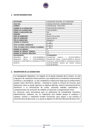 Este documento presenta el sílabo de la asignatura Investigación Operativa I impartida en la Universidad Nacional de Chimborazo. El sílabo describe los objetivos generales de la asignatura, los contenidos organizados en tres unidades principales sobre programación lineal, el método simplex y el método algebraico. También incluye los resultados de aprendizaje esperados, evidencias de aprendizaje, acuerdos éticos y la metodología a seguir. La asignatura busca que los estudiantes aprendan métodos matemáticos y computacionales para la