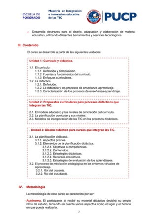 Este documento presenta la descripción de un curso de maestría sobre el desarrollo curricular y didáctico con TIC. El curso analiza la importancia del modelo educativo para orientar las propuestas curriculares y didácticas, y cómo las TIC pueden contribuir a los objetivos curriculares. El curso se divide en tres unidades sobre currículo y didáctica, propuestas curriculares con TIC, y diseño didáctico con TIC. Los estudiantes aprenderán a aplicar fundamentos científicos para la gestión educ