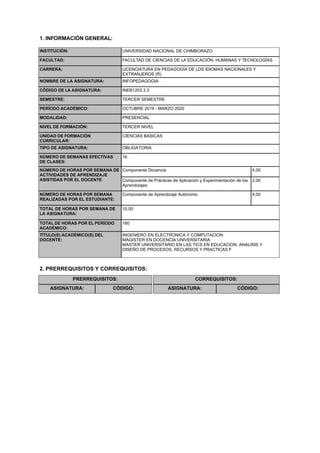 Este sílabo describe la asignatura de Infopedagogía de la Universidad Nacional de Chimbote. La asignatura forma parte de la carrera de Licenciatura en Pedagogía de los Idiomas Nacionales y Extranjeros. El sílabo incluye información general sobre la asignatura, sus objetivos de aprendizaje, unidades temáticas, actividades y métodos de evaluación. La asignatura busca que los estudiantes aprendan a usar las TIC para mejorar sus prácticas educativas y promover el aprendizaje.